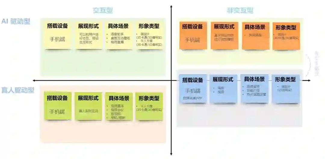 移动端使用场景通常是交互方式与驱动方式综合影响的结果,根据有交互/无交互,真人驱动/AI驱动;移动端的使用场景可划分为:语音助手、桌面互动壁纸、电商直播、新闻播报、视频通话、视频会议、短视频、相机、相册等。