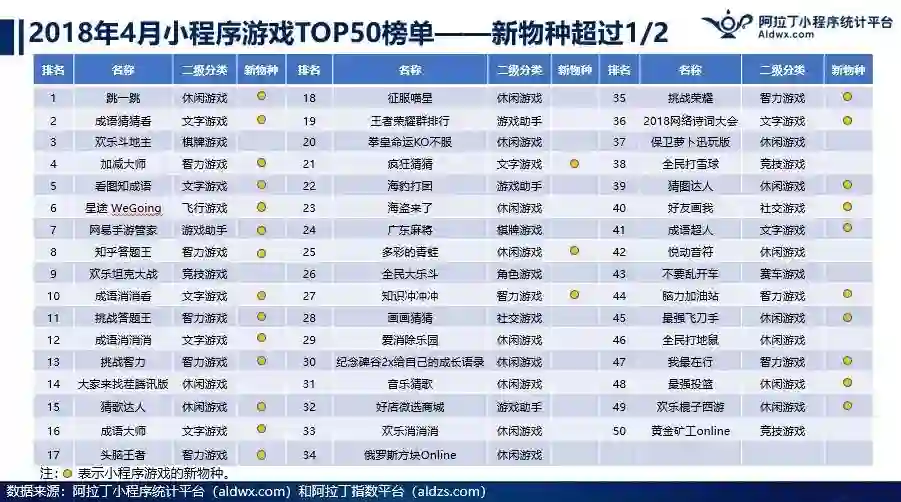 阿拉丁小程序统计平台的数据显示,在 2018 年 4 月小程序游戏榜单 TOP50 中,新物种超过了 50%,也就是说有一半是新出的游戏,《欢乐斗地主》在 APP 时代拥有数量众多的用户,但是新出的《跳一跳》直接绕过了 APP,在小程序战场实现赶超。类似的游戏还有很多,且比传统手游做得更好。