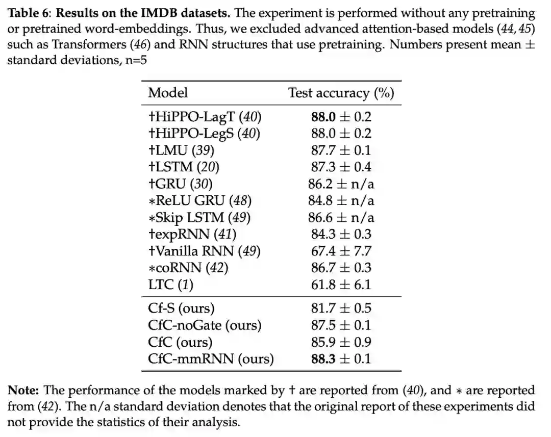 在情感分析方面,该研究在互联网电影数据集 IMDB 上测试了 CfC 模型和其他一些经典模型的性能,结果如下: