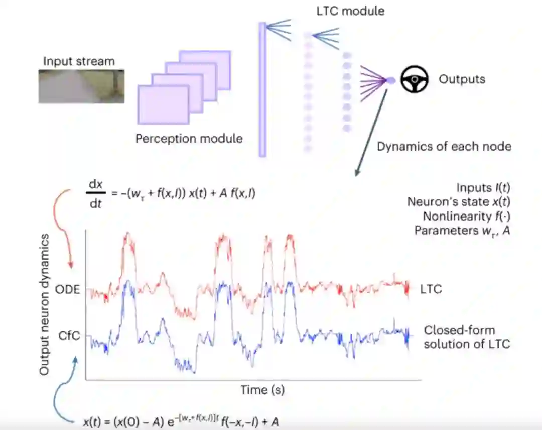微分方程使我们能够计算事件在演化过程中的状态,使用 CfC 神经网络,人们可以在任意时间计算这个方程。由于不需要一步步求解微分方程,因此计算速度也快得多。
