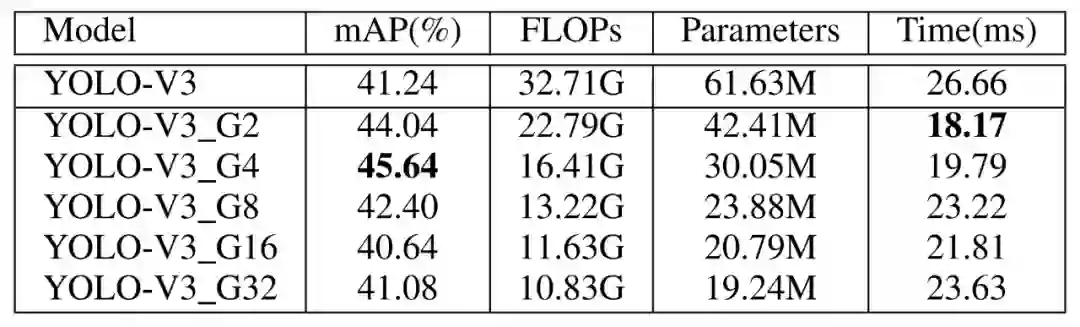由以上结果可以看出DualConv能够应用于标准深度神经网络架构和轻量级深度神经网络架构,且在各个图像分类数据集上有很强的泛化能力。为了验证DualConv可以泛化到不同的任务,我们将DualConv进一步应用于目标检测的YOLO-V3模型。