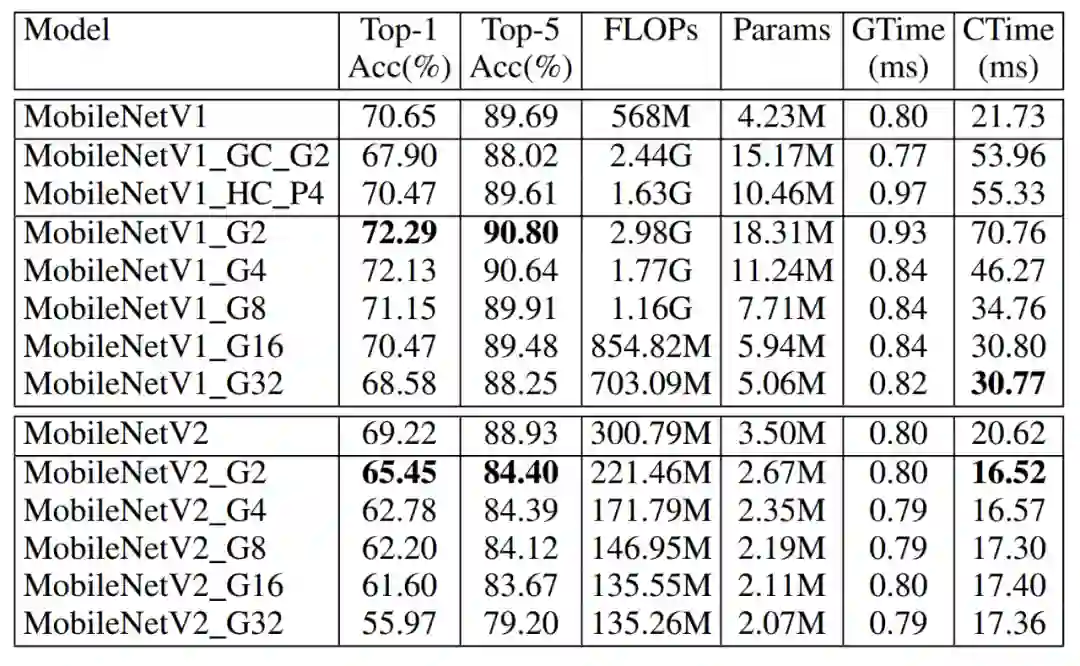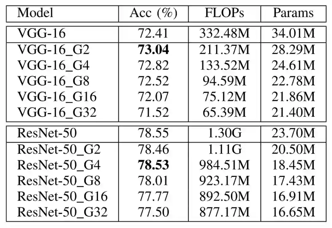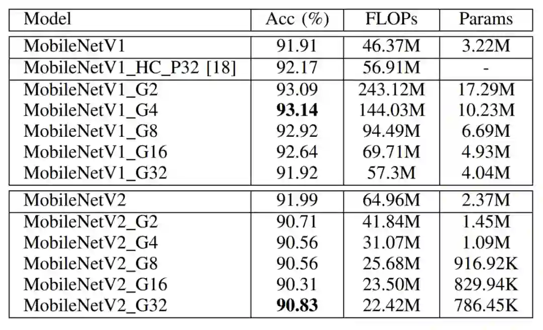 从表1我们可以看出,DualConv对比其他方法有更高的准确度。在加大组数G,进一步降低深度神经网络参数量和计算量的同时,只损失一点准确度性能。