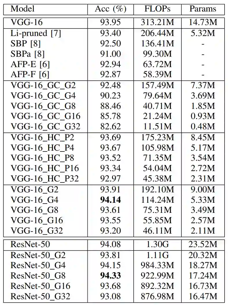 表 1 DualConv应用于VGG-16和ResNet-50在CIFAR-10数据集上的性能比较(VGG-16(ResNet-50)_Gα代表使用DualConv修改的VGG-16或ResNet-50网络,VGG-16_GC_Gα代表组卷积修改的VGG-16,VGG-16_HC_Pα代表异构卷积修改的VGG-16,其中α表示DualConv和组卷积的组数G或异构卷积的参数P。)