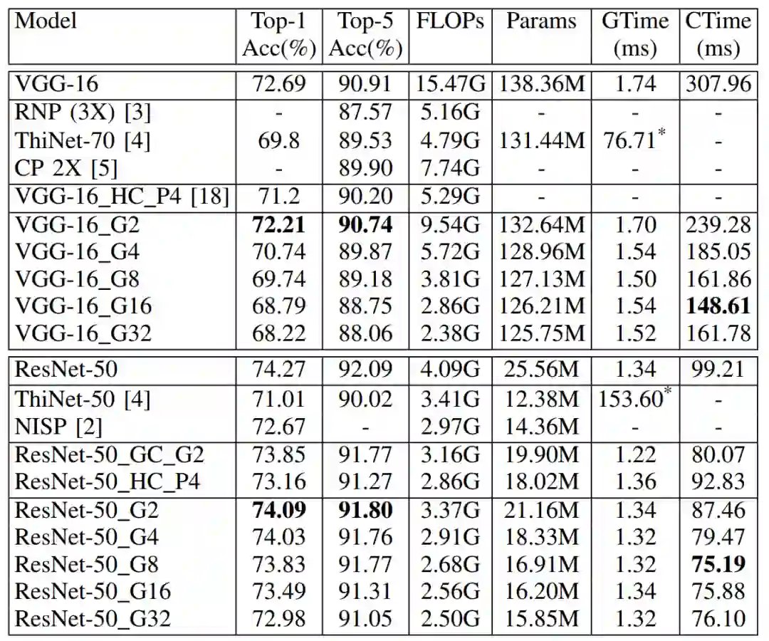 表 5 DualConv应用于VGG-16和ResNet-50在ImageNet数据集上的性能比较(GTime代表GPU时间,CTime代表CPU时间,*代表在一个M40 GPU进行推理(批大小为32)。)