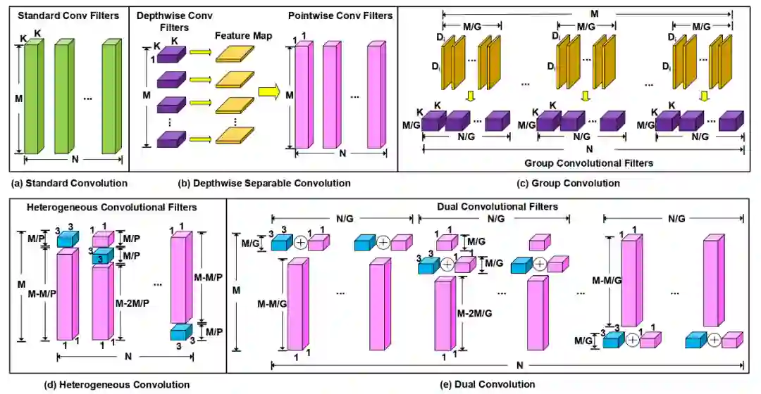 图 2 (a) 标准卷积、(b) 深度可分离卷积、(c) 组卷积、(d) 异构卷积、(e) 双卷积的卷积层结构图