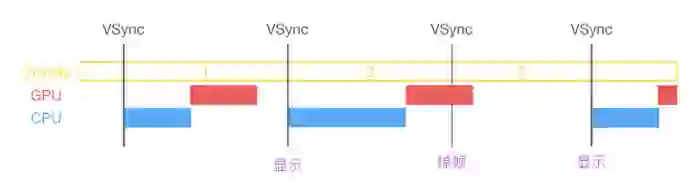 但是呢,垂直同步带来了一个新的问题—掉帧。所谓的掉帧,跟垂直同步有一定关系,因为垂直同步机制决定了如果在一个时钟周期内CPU或者GPU没有完成各自的任务的话,就会将帧缓冲区里的内容直接丢弃!掉帧并不能完全怪罪于垂直同步机制,更重要的原因是我们作为开发者没有进行足够的优化,将过重的任务派发到了CPU或者GPU上,下图(from:iOS 保持界面流畅的技巧)是掉帧的图示,表明CPU或者GPU任意一个没能在时钟周期内完成自己的任务的话都会导致卡顿掉帧。