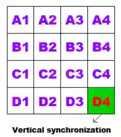 我们知道,远古时代的CRT显示器的显示原理是用电子枪扫描荧光屏来发光。如上图所示,电子枪按照从左到右,然后从上到下的顺序扫描。当电子枪换到新的一行准备进行扫描时,也就是上图A4、B4、C4、D4的位置,显示器会发出一个水平同步信号;而当一帧画面绘制完成后,电子枪回复到原位准备画下一帧前,也就是上图D4的位置,显示器会发出一个垂直同步信号。垂直同步信号的作用一方面是通知显示器回到A1位置,另外一方面,也通知显卡,准备输出下一帧画面。现在已经是液晶显示器的时代了,不再使用电子枪扫描了,但是原理还是类似的,水平同步信号和垂直同步信号还是一样被使用的。