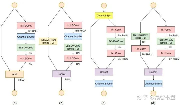可以看到,这样一个简单的通道分离的操作带来了诸多好处;但是从理论上来说,这样的结构是否还符合short-cut的初衷(即bottleneck学到的是残差Residual部分)?这里笔者也不好妄加揣测,但是可以想到的是经过后面的Channel Shuffle的乱序之后,每个通道应该都会经过一次bottleneck结构。