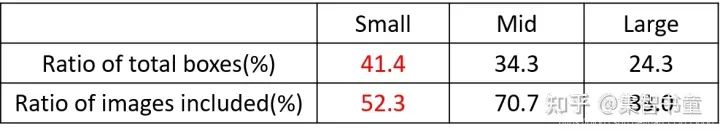 如上表所示,Coco数据集中小目标占比达到41.4%,数量比中目标和大目标都要多。但在所有的训练集图片中,只有52.3%的图片有小目标,而中目标和大目标的分布相对来说更加均匀一些。