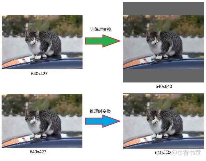 640-427=213,得到原本需要填充的高度。再采用numpy中np.mod取余数的方式,得到21个像素,再除以2,即得到图片高度两端需要填充的数值(为10【向上取整】和11【向下取整】),于是得到推理结果的尺寸为640×448。