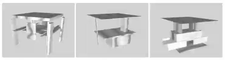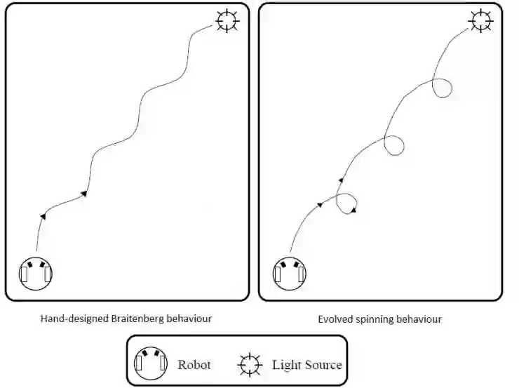 图 7:寻光机器人运动。走向光源时,手编 Braitenberg 式运动(左)和演变自旋运动(右)的路径。图8:桌子设计。使用通用进化设计系统,演变出三种桌子设计。