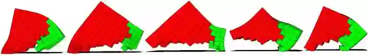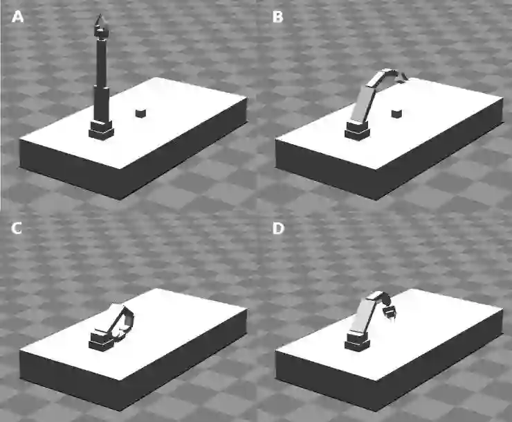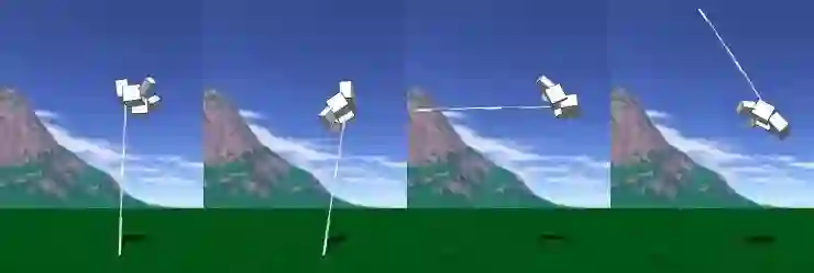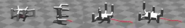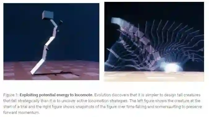 来自原文的图片解说摘录:图 1:利用潜在力量运动。进化发现:让一个体型庞大的生物有策略性地跪倒,比发现主动的运动策略更简单。左边的图显示了试验开始时的生物,右边的图显示了随着时间推移,生物跪倒和翻转以保持前向动量。
