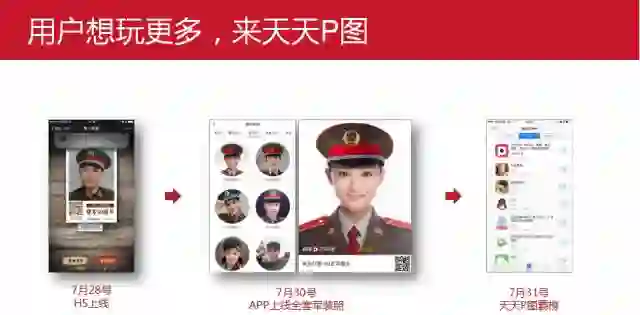 在今年建军节期间刷爆朋友圈的“军装照”是天天P图与人民日报合作的产品,这个产品的创意由人民日报提出,希望在建军节,有一种方式让大众能广泛参与,唤起大众的爱国情绪。契合的时机,人民日报的渠道资源启动,让“军装照”的火爆自然而然地发生,大众在没有引流、导流的情况下,能主动进行传播转发,运营这时就要做到顺势而为,让它爆发出去。
