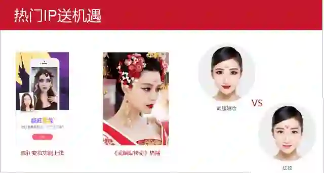 天天P图于2014年上线,前期主要进行的是一些基础功能的优化与迭代,在上线大半年的时间里知道天天P图的人并不多,直到2015年初依靠“全民cos武媚娘”的活动刷爆社交平台。在武媚娘妆之前,天天P图的“疯狂变妆”功能中已经有很多素材,包括类似于“武媚娘妆”的“红妆”,但它们都没有像“武媚娘妆”一样被用户传播开来。为什么“武媚娘妆”会火呢?