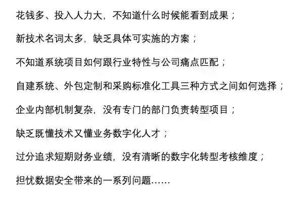 每家企业所处发展阶段、文化和目标愿景的不同,会出现各种阻碍数字化转型成功的因素。我们常听到企业在讨论: