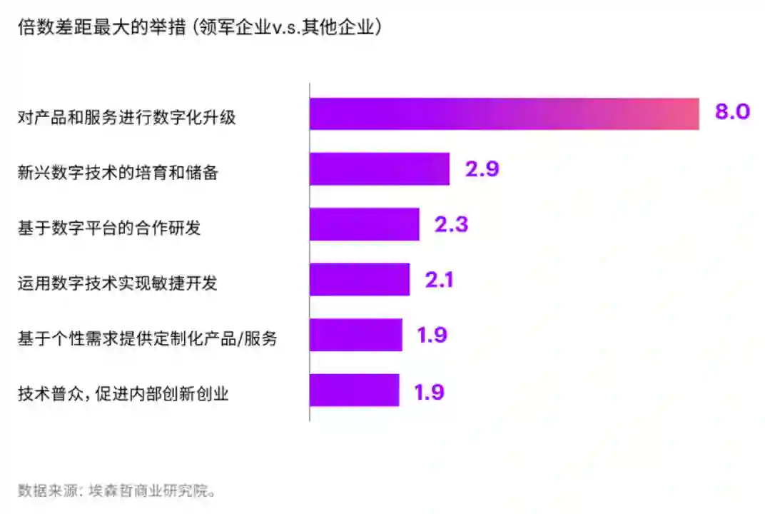 大部分企业在开拓数据变现模式、实现数据流和业务流程有效连接等方面取得大幅提升的同时,领军企业具有优势的指标都围绕着创新相关的指标。比如,在产品和服务的数字化升级能力的表现上,领军企业是其他企业的8倍;新兴数字技术的培育和储备上,也形成接近3倍的差距。