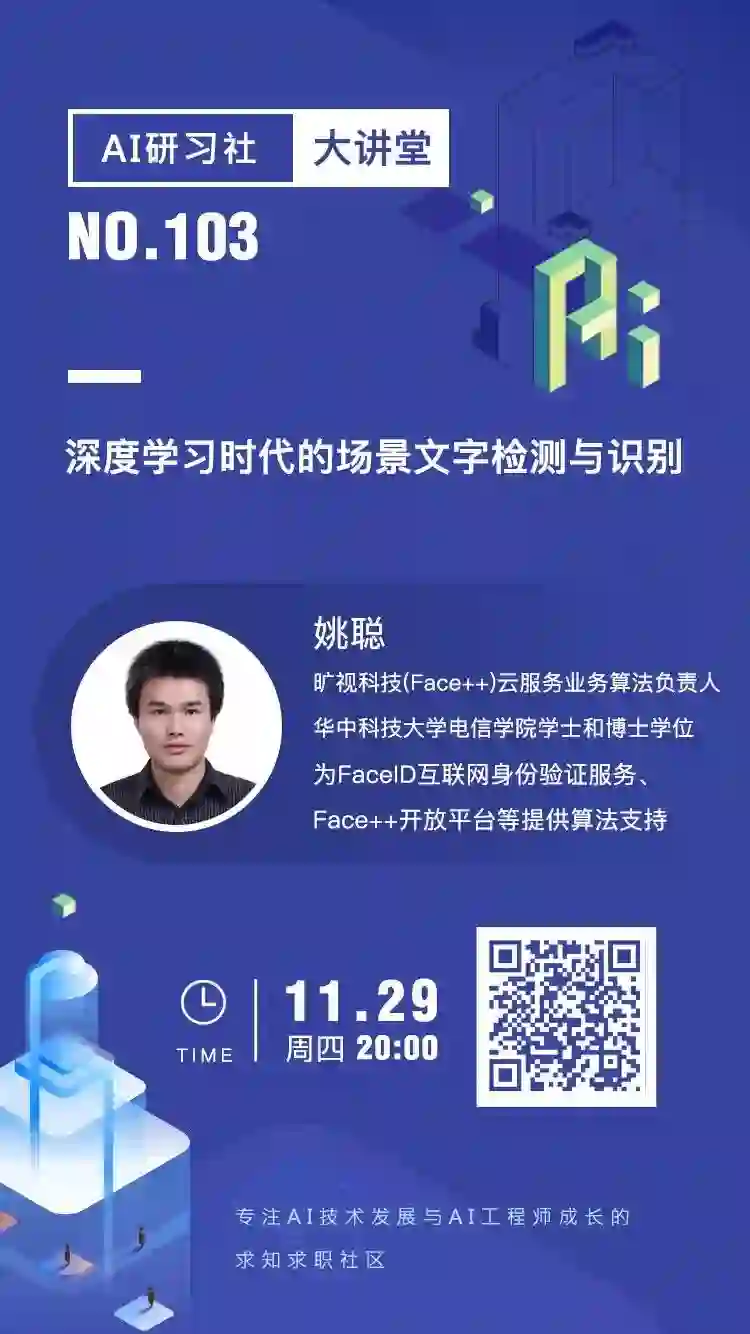 姚聪:于华中科技大学电信学院获得学士和博士学位,其主要研究方向为自然场景文字检测和识别。在国际重要期刊 IEEE TPAMI, IEEE TIP 以及顶级会议 CVPR、ICCV 和 ECCV 等上发表论文十余篇。目前在旷视科技 (Face++) 担任云服务业务算法负责人,主持自然场景 OCR、人脸活体检测等技术的研发工作,为 FaceID 互联网身份验证服务、Face++开放平台等提供算法支持。