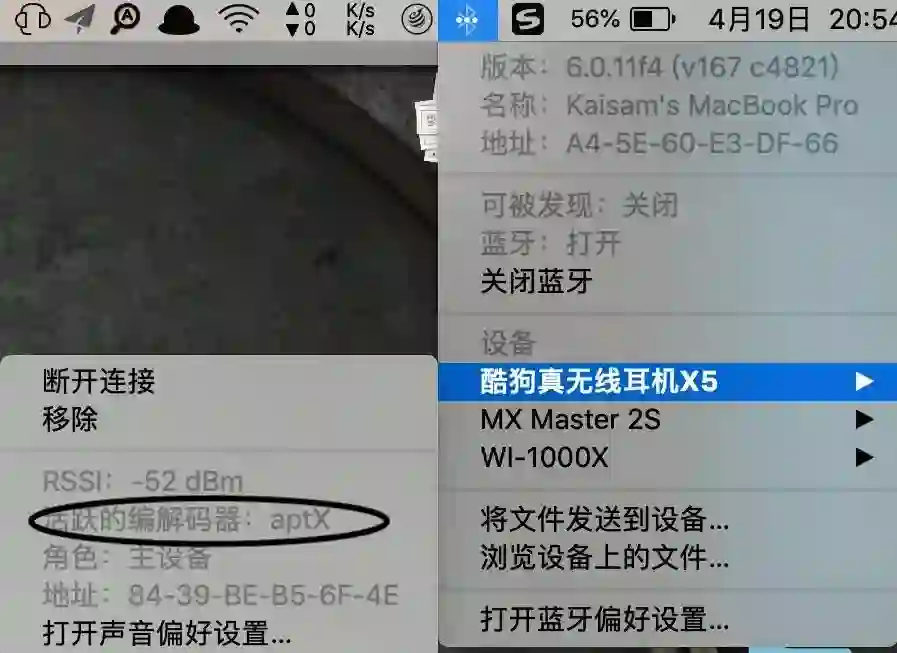 研究一番后发现,原来没有延迟的这四台设备,均支持 apt-X,而 iPhone 只有 AAC 和 SBC 协议,恰巧,酷狗 X5 只支持 apt-X 和 SBC,没有 AAC。所以我们大致可得,iPhone 上的延迟,是酷狗 X5 不支持 AAC、iPhone 不支持 apt-X 共同惹的祸。
