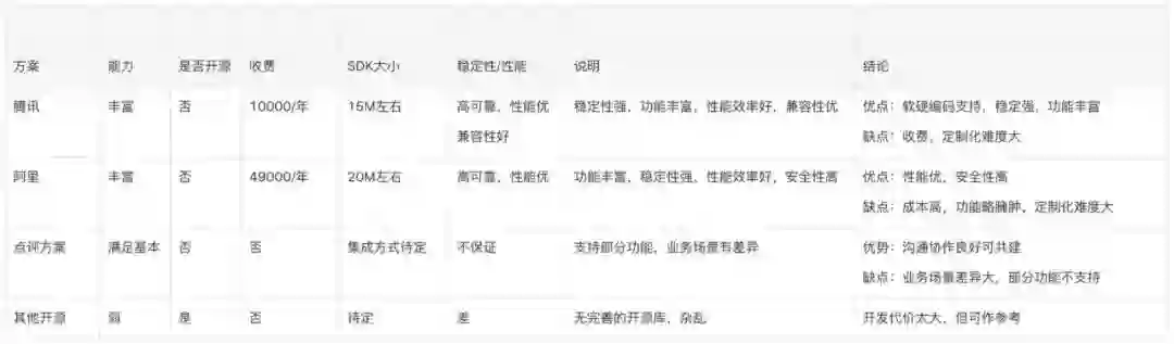 阿里和腾讯的云视频点播方案比较成熟,集成度高,且能力丰富,稳定性及效率也很高。但两者成本较高,需要收费,且SDK大小均在15M以上,对于我们的业务场景来说有些过于臃肿,定制性较弱,无法迅速的支持我们做定制性扩展。