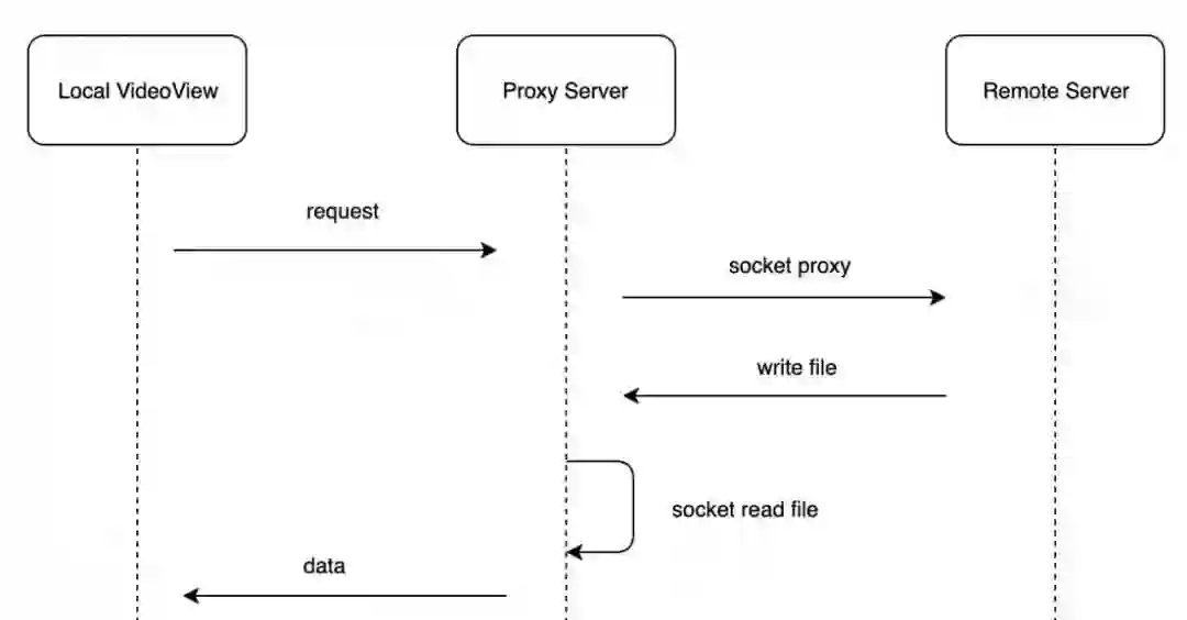 针对缓存问题,引入AndroidVideoCache的技术方案,利用本地的代理去请求数据,先本地保存文件缓存,客户端通过Socket读取本地的文件缓存进行视频播放,这样就做到了边播放边缓存的策略,流程如下图: