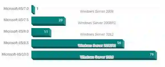 微软不再支持 Windows Server 2008 和 Windows Server2008 R2。但是,我们仍然找到了 21 个运行这些操作系统的站点。在大型企业中,管理补丁和软件生命周期是非常困难的工作。对于这 21 家公司来说显然更是如此。请注意,尽管 Windows Server 2008 的生命周期已终止(停止支持),但它确实还会收到微软的重要安全补丁。