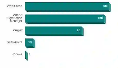 WordPress 占有率很大,在《财富》千强中有约 14% 的网站使用它。特别是,当我们考虑到其开源背景和缺乏企业技术特性时,这个数字更是来之不易。这个 14% 的比例低于在较大样本中观察到的 30%以上的数字。