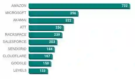 下图显示了在《财富》千强中 ASN 的出现次数。数据通过将发现的子域解析为 IP->ASN 得出。