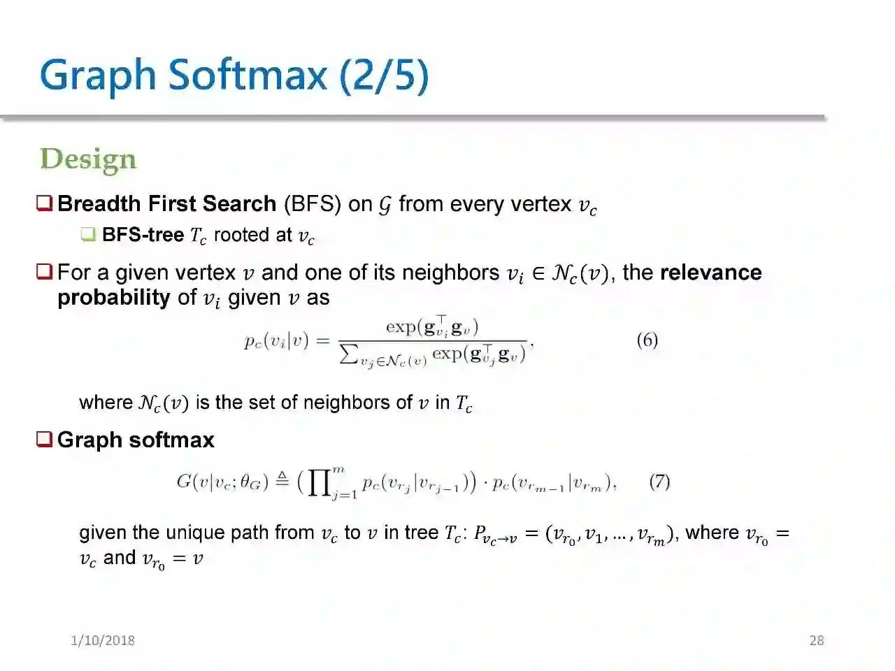 对于每个给定的结点 Vc,我们都需要以 Vc 为根来进行一次 BFS 宽度优先搜索,然后得到一颗以 Vc 为根的 BFS tree。对于这棵树上的每一个节点,我们都定义了一个 relevance probability。实际上是一个在 Vc 的邻居上的 softmax。