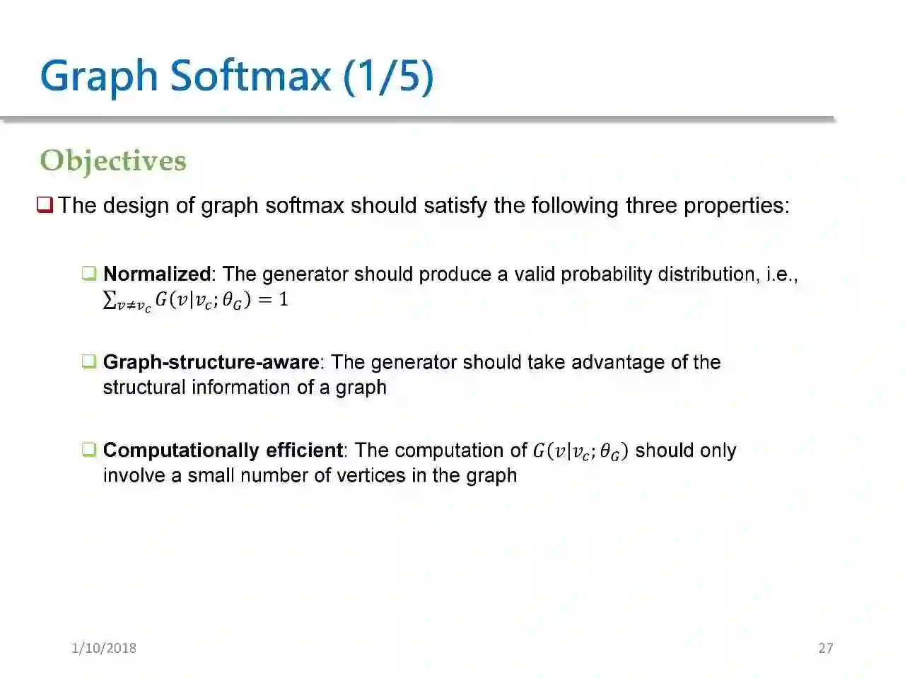 在 GraphGAN 中,我们的目标是设计出一种 softmax 方法,让其满足如下三个要求。第一个要求是正则化,即概率和为 1,它必须是一个合法的概率分布。第二个要求是能感知图结构,并且能充分利用图的结构特征信息。最后一个要求是计算效率高,也就是 G 概率只能涉及到图中的少部分节点。
