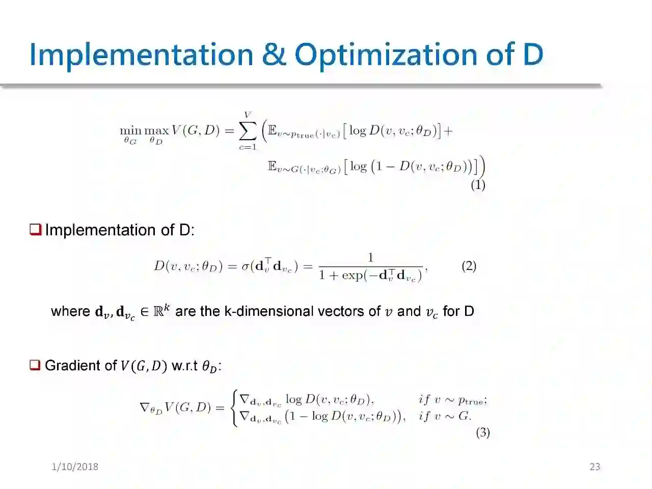 下面来看生成器的实现和优化。在 GraphGAN 中,我们选了一个非常简单的生成器,生成器 D(V, VC) 就是一个 sigmoid 函数,它先将两者的 embedding 做内积,再用 sigmoid 函数进行处理。对于这样的实现,它的梯度自然也较为简单。