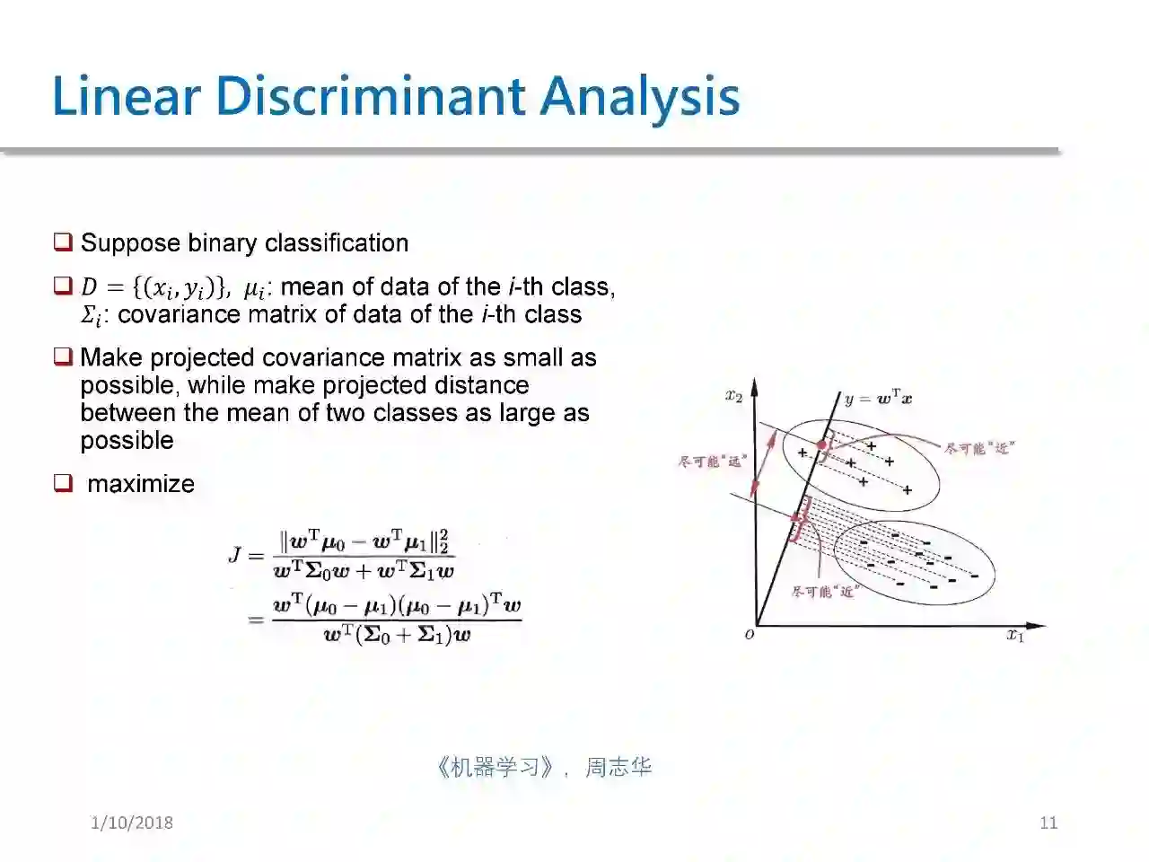 LDA 线性判别分析是一种传统的有监督降维方法。我们可以看到,右图里面有两类点,有正号表示的一类和有负号表示的一类。