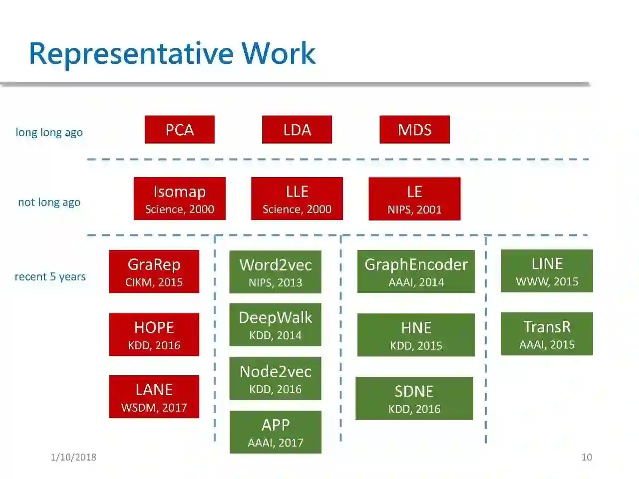 上图是我整理的 GRL 方法代表作。按照时间顺序可将它们分为三类,第一类是传统方法,包含 PCA、LDA、MDS 等降维方法。