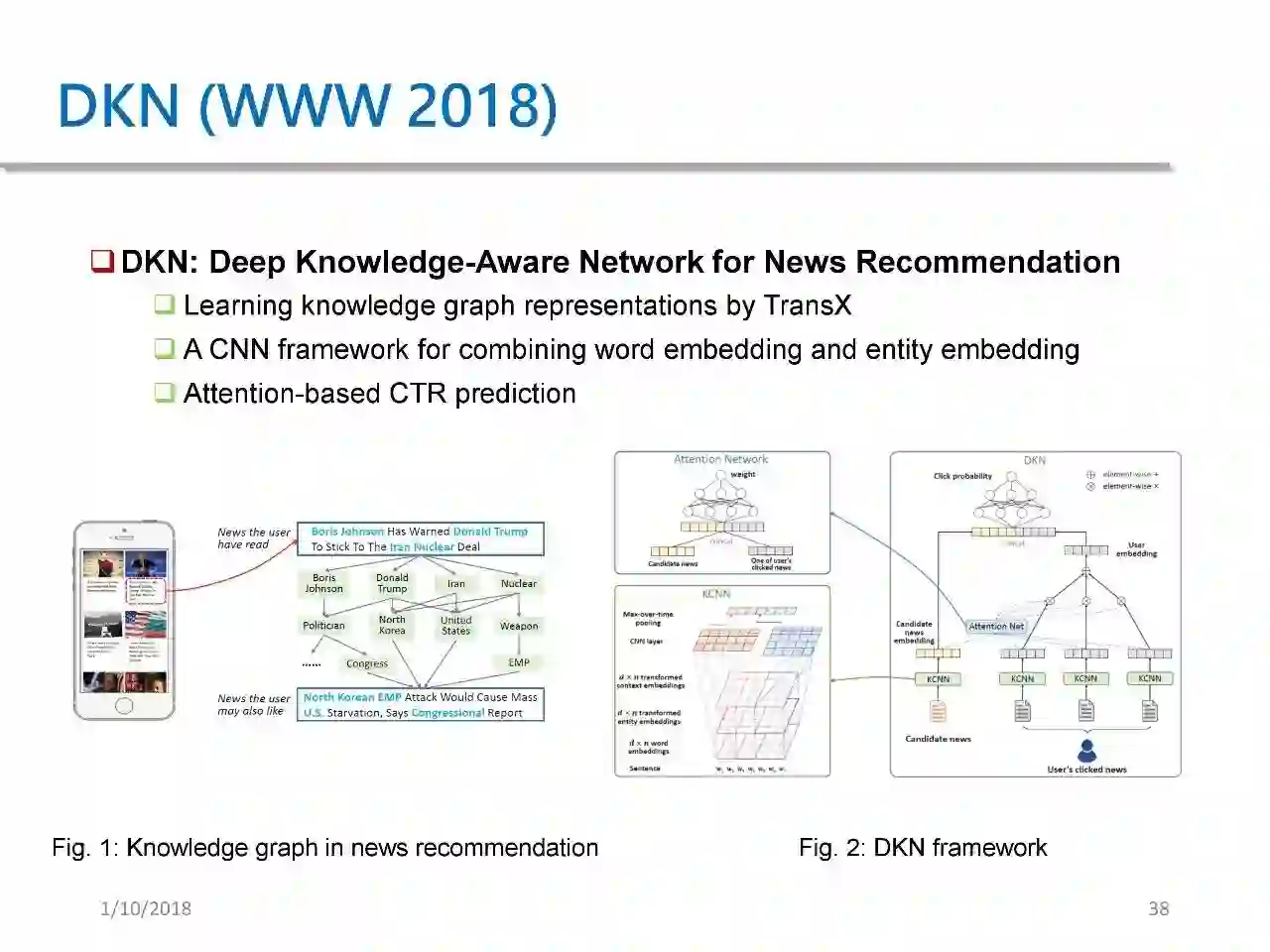 DKN 是我们发表在 WWW 2018 上的论文,它提出了一个可用于新闻推荐的 deep knowledge-aware network。在 DKN 中,我们将 KG 中的 entity embedding 和 word embedding 在一个 CNN 框架中加以结合,并且提出了一种 attention based 点击率预测模型。