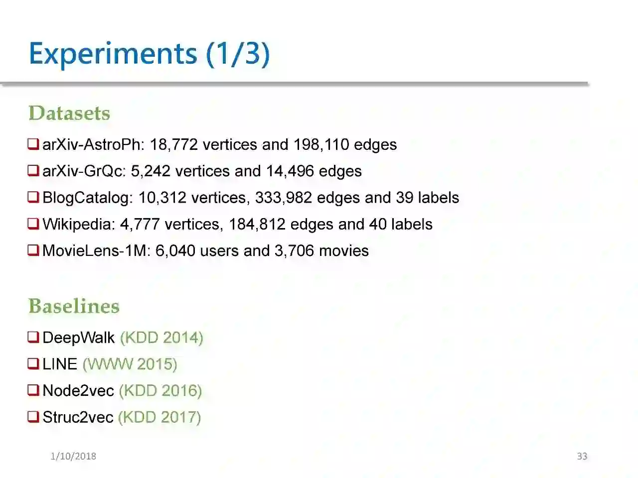 我们的实验数据集一共是如上五个。Baseline 选用的是DeepWalk,LINE,Node2vec 和 Struc2vec。