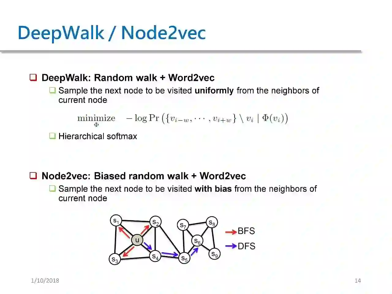DeepWalk 相当于 random walk + word2vec。从图中的每个节点出发,随机进行 random walk,从当前节点均匀、随机地选择下一个节点,然后再从下个节点均匀、随机地选择下一个节点。