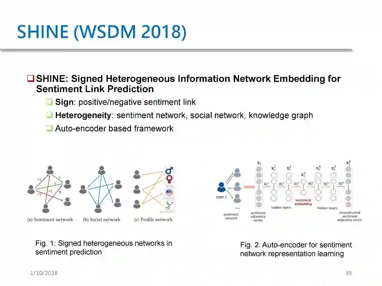 第二个应用是 SHINE,这篇论文发表于 WSDM 2018。它的目的在于预测微博用户对名人明星的情感。我们提出了一种基于自编码器的框架,这个框架其实类似于 SDNE,将它应用于三者并加以结合进行情感预测。