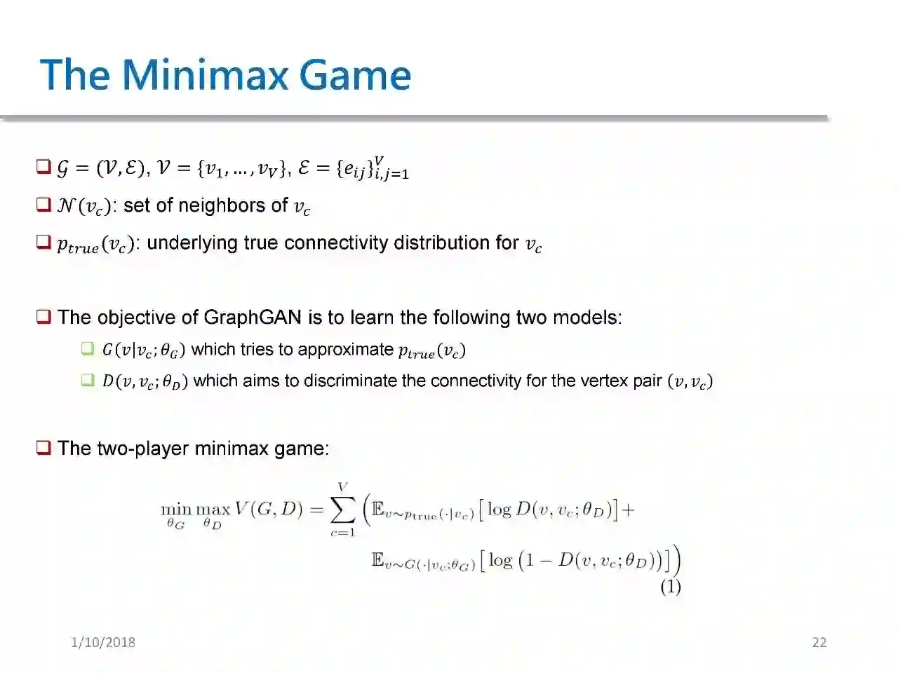 GraphGAN 试图学习以下两个模型:第一个是 G(V|Vc),它试图去接近 Ptrue (Vc)。第二个是 D(V|Vc),它的目标是判断 V 和 Vc 是否有边。