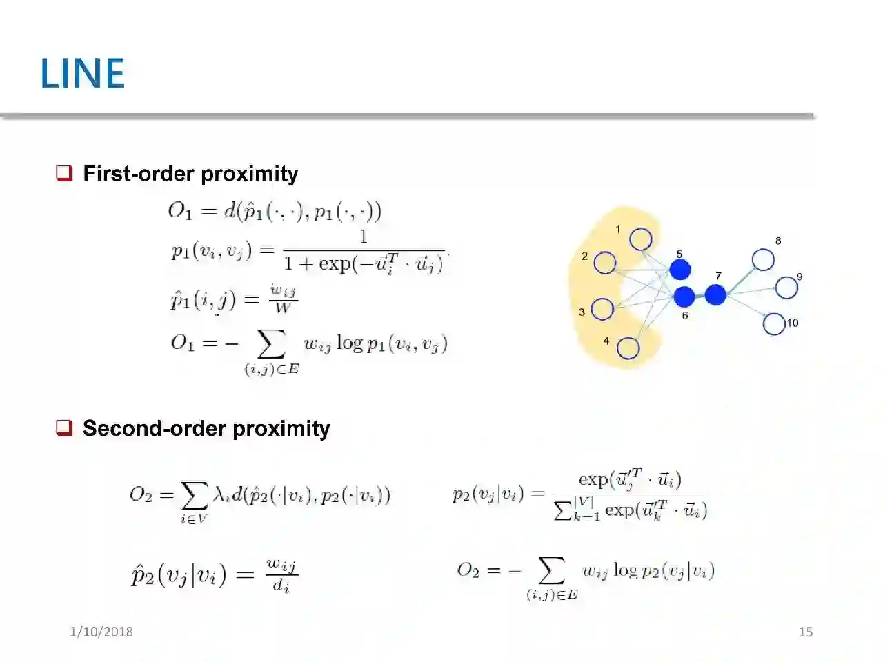 LINE 的全称是 Large-scale Network Information Embedding。这篇文章发表于 WWW 15。这个工作属于我们之前提到的自定义损失函数,因为它定义了两种损失函数,一种是一阶的临近关系,另一种是二级临近关系。