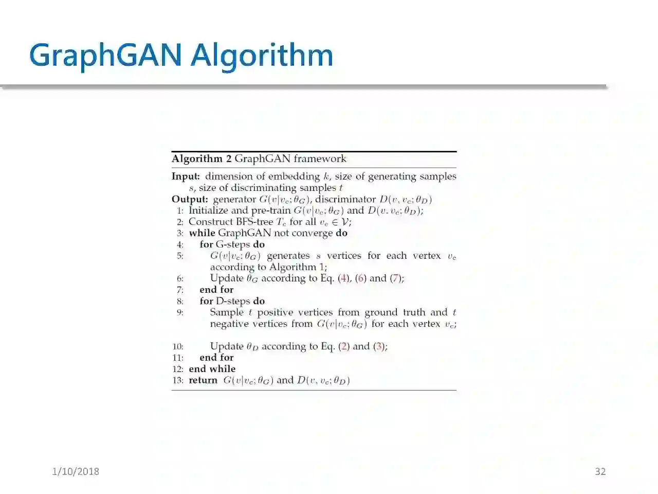 GraphGAN 的算法如上,输入是一些超参数,我们想输出生成式模型 G 和判别式模型 D。第 3-12 行是算法的每一次迭代过程。在每一次迭代过程中,我们都重复用生成器来生成 s 个点,并用这些点来更新 θG 的参数。