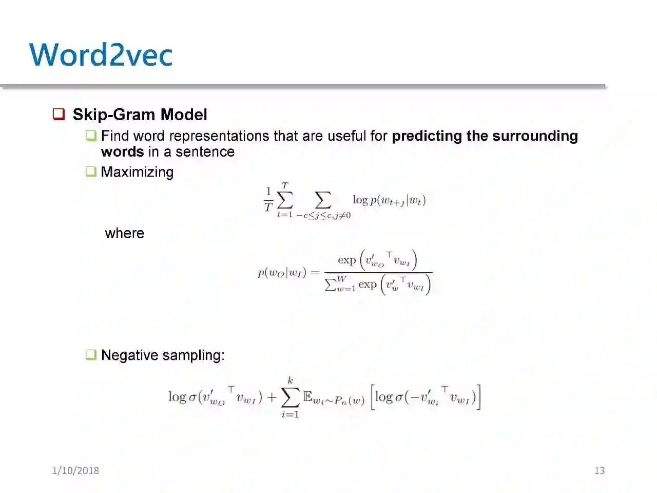 Word2vec 中有一个 skip-gram 模型,这个模型的本质在于为每个词得到一个特征,并用这个特征来预测周围的词。因此,其具体方法就是将概率最大化。这个概率是指,给定一个中心词 WT,在以它为中心、窗口为 T 的范围中的每个词的概率。