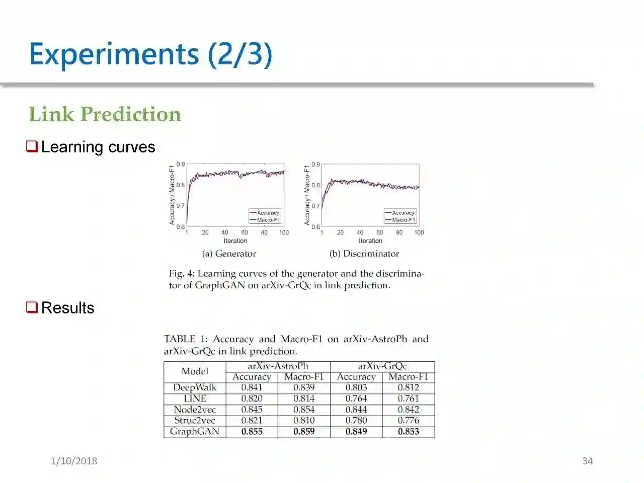 我们将 GraphGAN 用到了如下三个测场景中,第一个是 link prediction,预测两个点之间是否有边的概率。图 4 展示的是 GraphGAN 的学习曲线,对于生成器而言,在训练大概十轮之后就很快趋于稳定,并且后续一直保持性能。