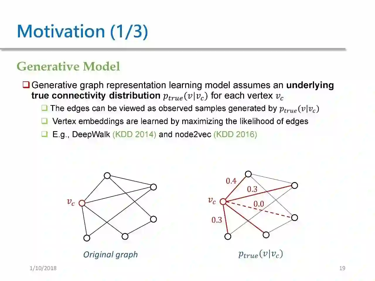 假设图中对于每个 Vc 都有这么一个分布,那么图中的每条边都可以看作是从 Ptrue 里采样的一些样本。这些方法都试图将边的似然概率最大化,来学习 vertex embedding。我们之前提到的 DeepWalk 和 Node2vec 都属于生成式模型。