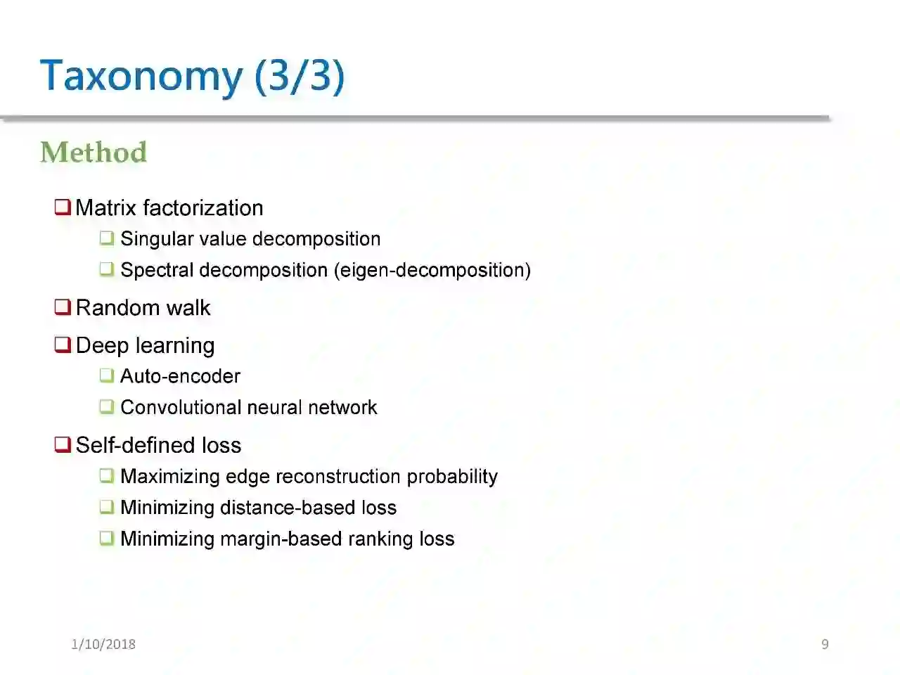 第四种方法是基于一些自定义的损失函数。这其中又包括三种情况,第一种是最大化边重建概率,第二种是最小化基于距离的损失函数,第三种是最小化 margin-based ranking loss,这种方法常见于 KG embedding。