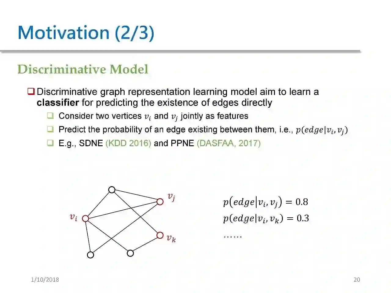 判别式模型是指,模型试图直接去学习两个节点之间有边的概率。这种方法会将 Vi 和 Vj 联合作为 feature,然后输出的是 edge 的概率 P(edge|Vi, Vj)。这种方法的代表作是 SDNE,以及 DASFAA 上的一篇 PPNE。