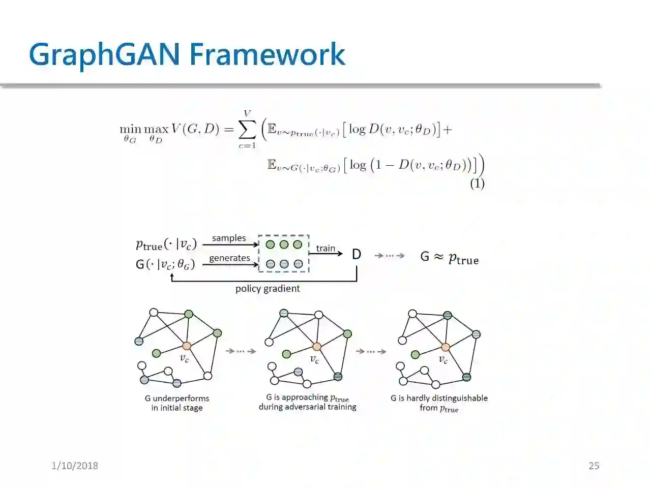 通过上图可以看出,我们在每一步的迭代中,从 Ptrue 中 sample 出来了一些跟 Vc 真实相邻的绿点,然后从 G 中又生成了一些跟 Vc 相连的蓝点。我们将绿点作为正样本,将蓝点作为负样本来训练 D,在得到 D 之后,再用 D 中的信号去反过来训练 G。
