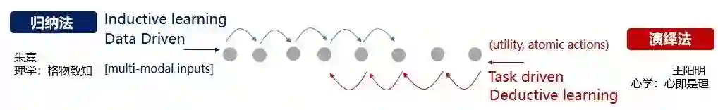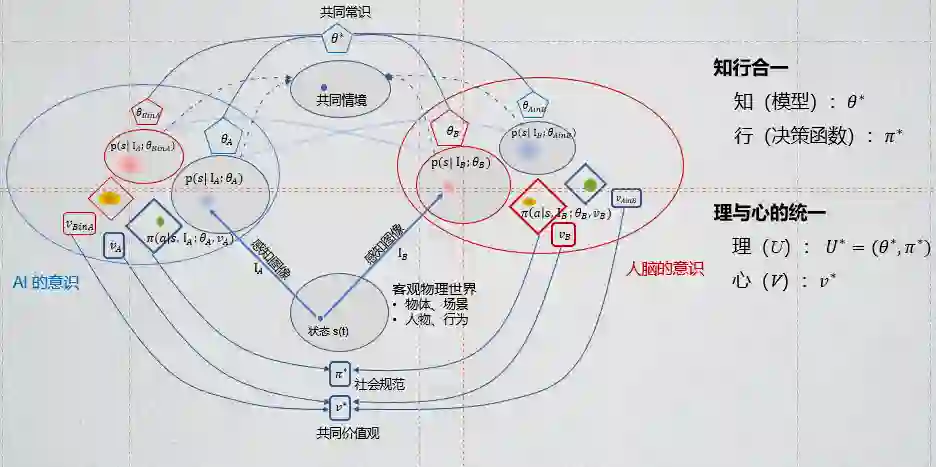 “知”模型和决策函数构成了“理”:U;价值函数则构成了“心”:V。“理”与“心”在这个认知架构里并存。通过交流,智能体之间会形成共同的价值观V*,社会规范π*,共同常识 θ*。