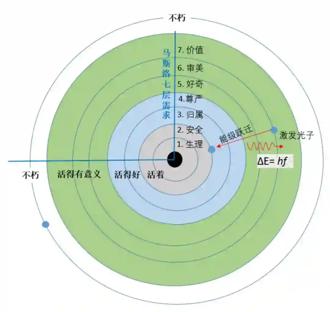 如果我们把这些人生的层次画出来,就有点类似物理学中的原子轨道的能级图。人生不同阶段在这些层级中跳转,主动或者被动,跃迁到新的能级轨道。积极向上的人生态度就是努力调整、升华自己的思想境界,实现更高的自我价值。