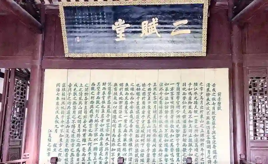 苏东坡两次夜游赤壁,写成《前赤壁赋》和《后赤壁赋》,就被供奉在赤壁公园的二赋堂,正面是《前赤壁赋》,背面写着《后赤壁赋》。虽然说《念奴娇·赤壁怀古》很容易理解,但是《赤壁赋》对于年轻人来说是很难读懂的,缺乏人生阅历,就无法体会苏轼的心境。这一点就像前面提到的对于《寒食帖》书法的欣赏,需要根据自己的经历来脑补这其中的 。